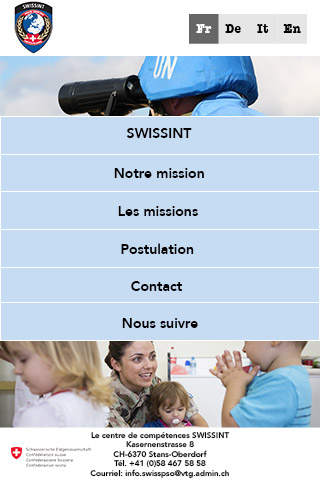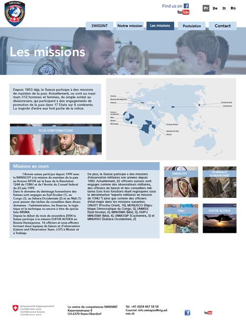 Maquettes de l'acueil, de la partie interne et de l'accueil mobile d'un site web pour SWISSINT